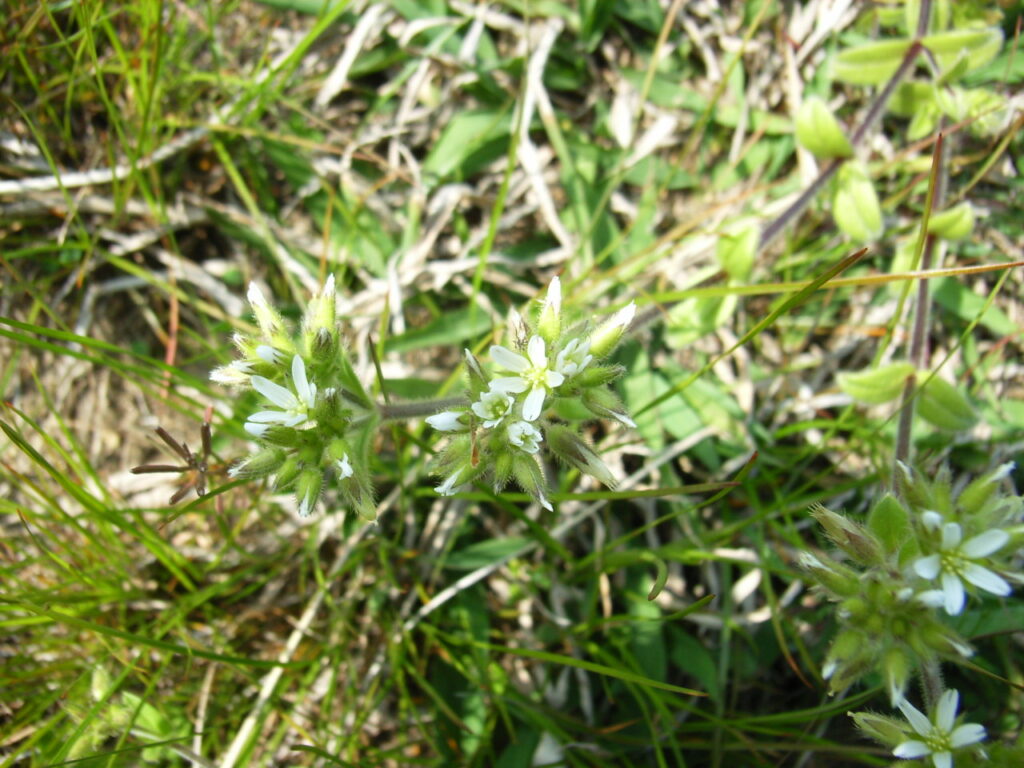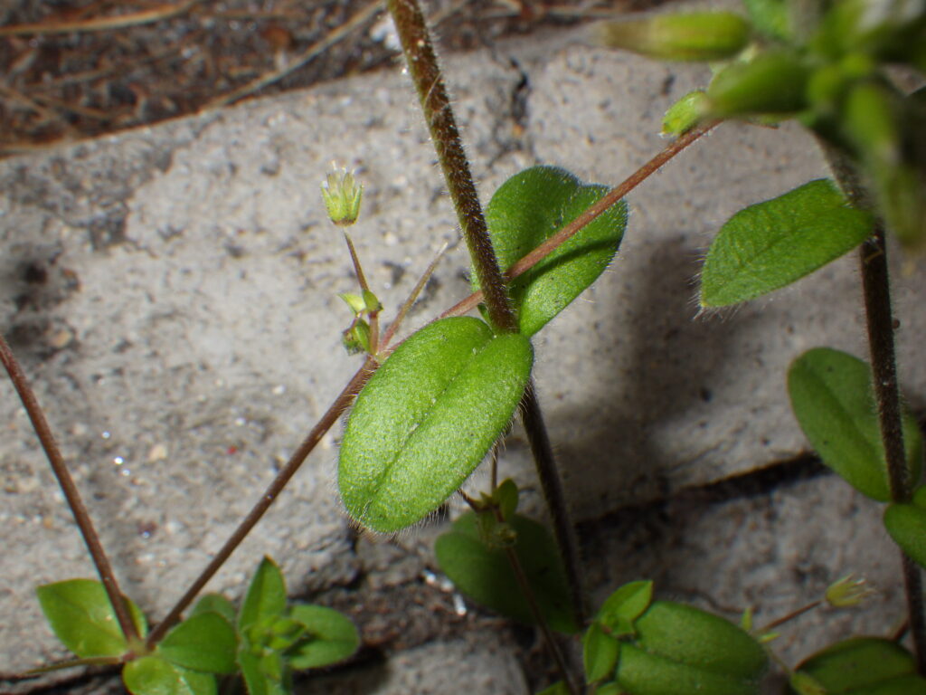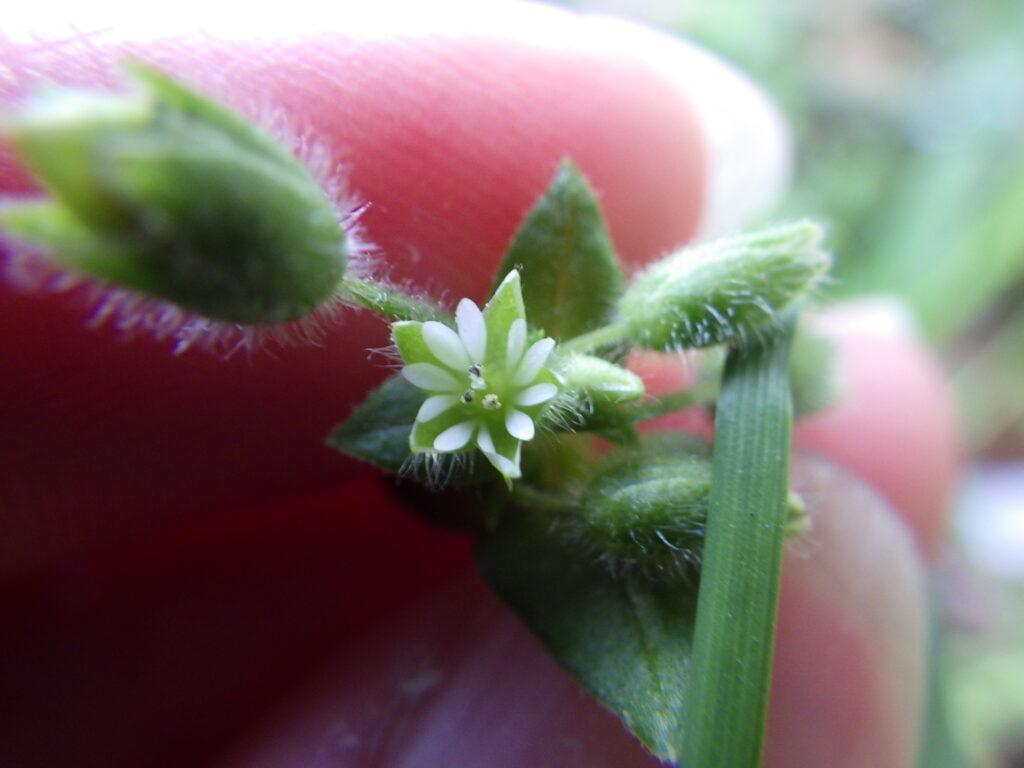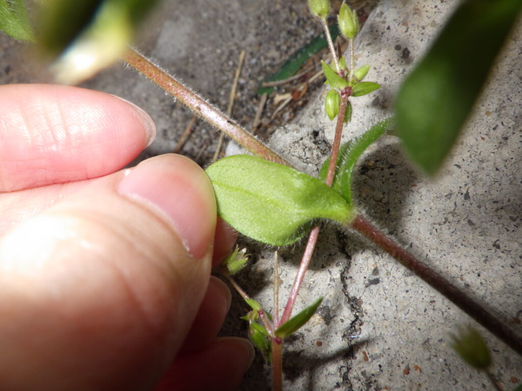 花は5枚の白い花弁がついており、花弁の先が僅かに裂け、フォークのようになっている点は大きな共通の特徴でしょう。また触ってみるとベタベタしており、腺毛が全身に多数生えていることも分かります。