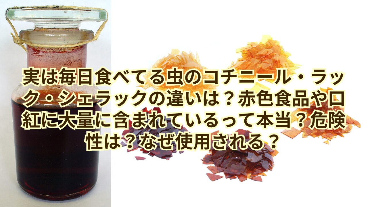 それはそれとして、実は不本意ながら日本人は毎日昆虫(から抽出された成分)を食べています。その代表例がコチニールカイガラムシが生成するカルミン酸を含むコチニールと、ラックカイガラムシが生成するラックを熱処理または溶媒抽出することで作られるシェラックです。