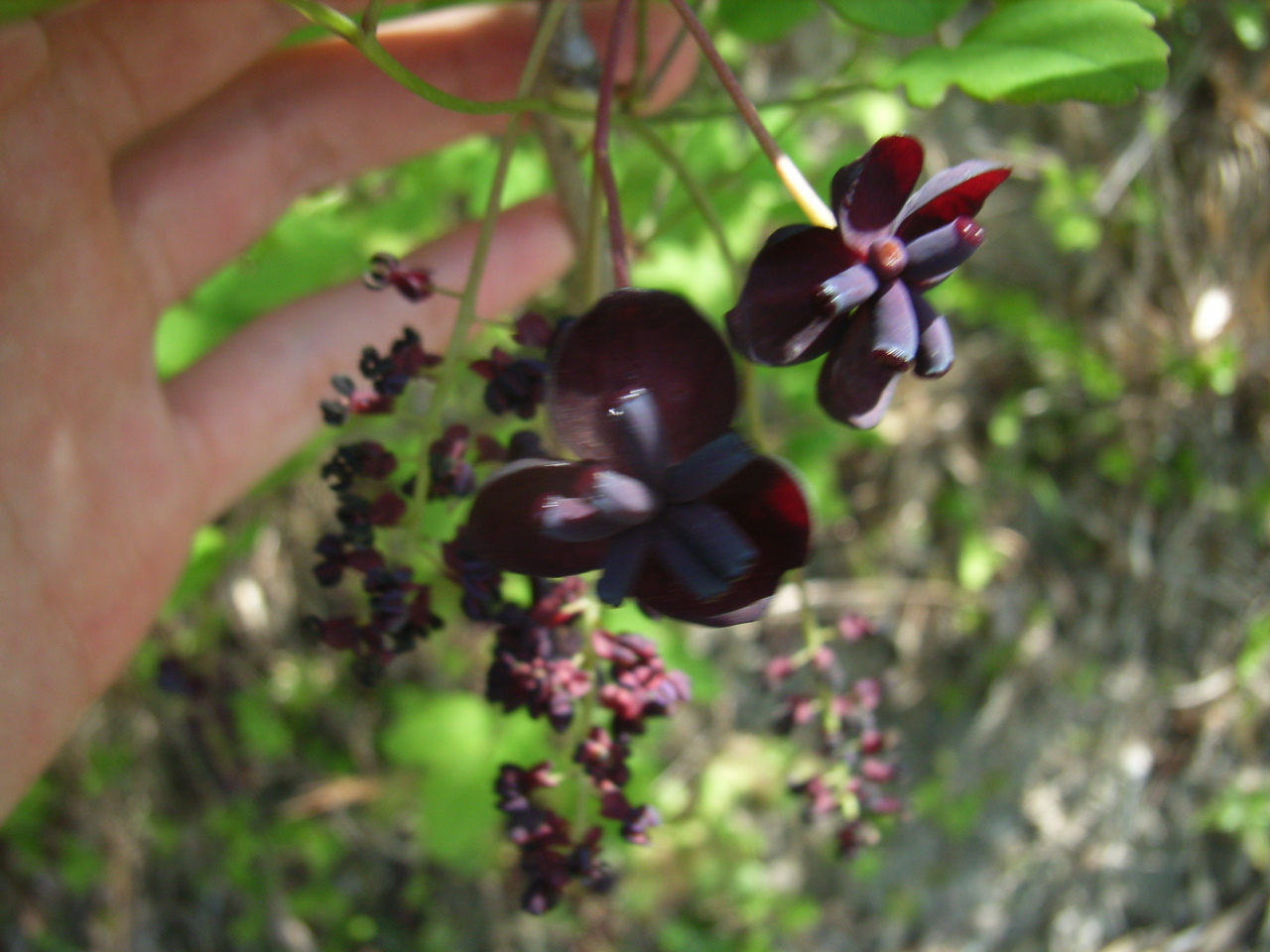 ミツバアケビの雄花:密につき萼片は濃紅紫色。