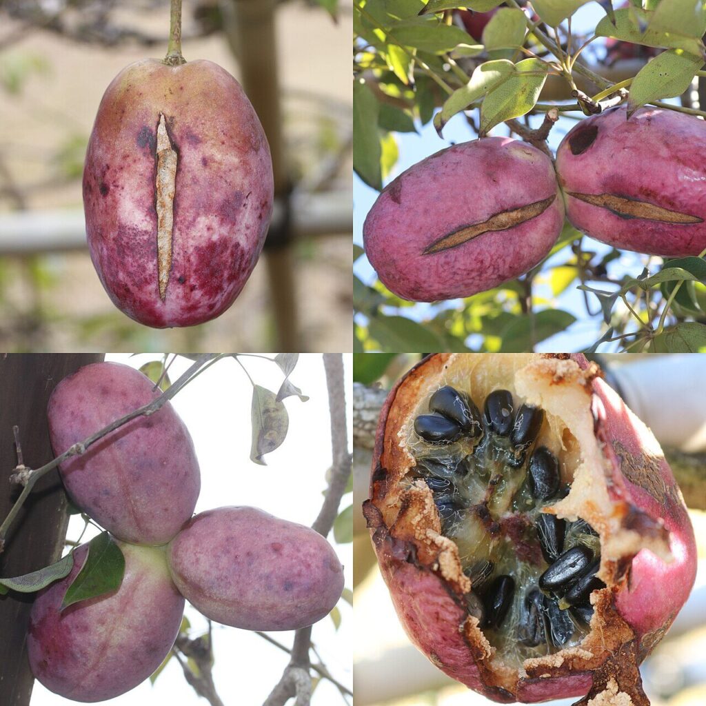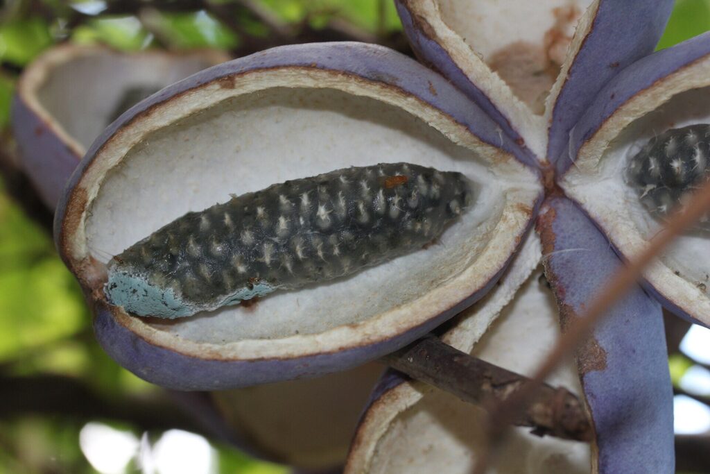 厚い果皮は緑色から熟するに連れて赤色~紫色に変わっていき、裂開すると内部を露出、白い寒天状の胎座に包まれた黒い種子が姿を現します。
