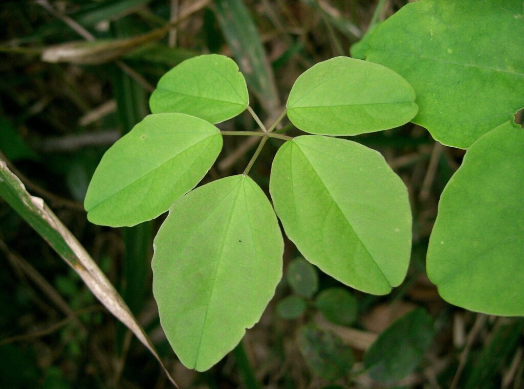 ゴヨウアケビの葉:五出複葉でかつ鋸歯あり。|By KENPEI – KENPEI’s photo, CC BY-SA 3.0, https://commons.wikimedia.org/w/index.php?curid=2009413
