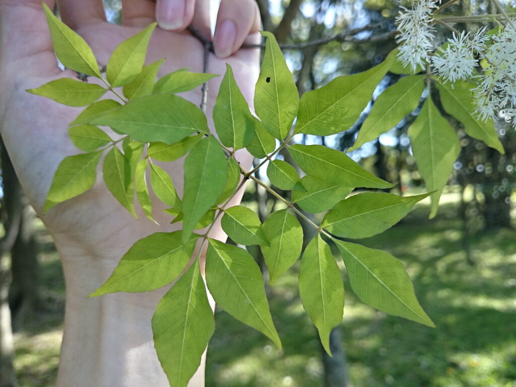 いずれもモクセイ科トネリコ属に含まれ、奇数羽状複葉である点はよく似ています。細かい形態としては小葉に関しては柄はなく、まれに短い柄が出ることがある程度である点、花冠がある白い花を持つ点、萼は果柄の先端に微細な円板状、わずかに歯があるだけという点も共通しています。そのため区別に迷うことがあるかもしれません。