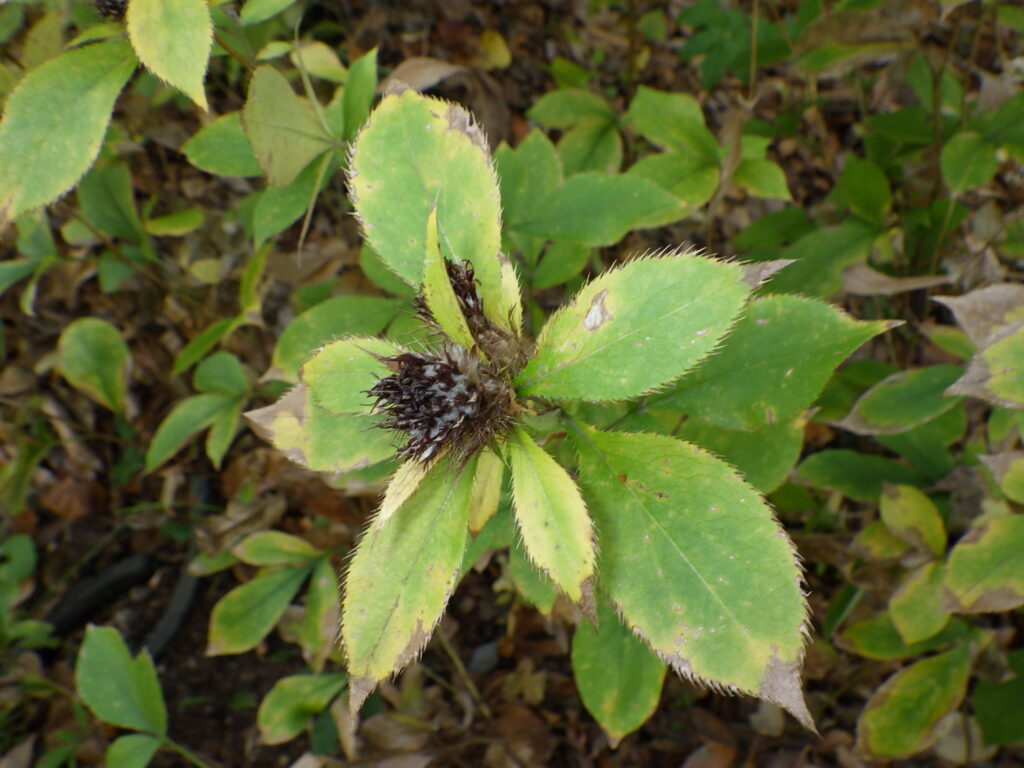 形態的には葉は鋸歯が目立ち、花はキク科らしく頭状花序(頭花)となり、筒状花のみから構成されます。冠毛は羽毛状で総苞は魚骨状の苞葉にかこまれるというのは、オケラ属の大きな特徴です。